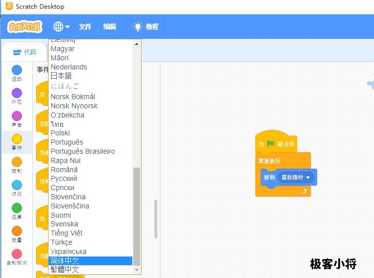 Scratch安裝好之后默認為英文版,支持全球不同國家和地區57種語言,我們可以點擊界面左上的地球圖標。下拉到最下邊,選擇簡體中文。這樣看起來舒服多了。