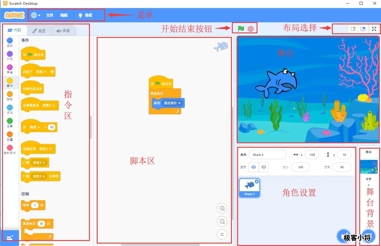接下來講解Scratch界面布局,其主要布局分為以下5大部分,菜單欄、指令區、舞臺區、腳本區、角色區,如下圖