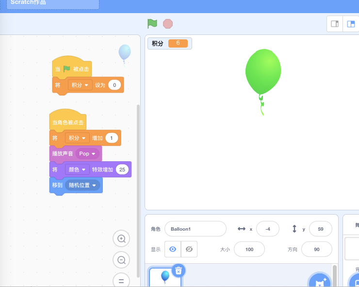 當(dāng)點(diǎn)擊綠旗程序開(kāi)始運(yùn)行,積分清零。當(dāng)點(diǎn)擊氣球一次時(shí)候,播放氣球被戳破的聲音Pop同時(shí)移動(dòng)到隨機(jī)另一位置并改變顏色,積分統(tǒng)計(jì)增加一。 如此重復(fù)本過(guò)程。積分統(tǒng)計(jì)逐步增加。