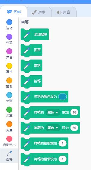 首先我們在擴展中添加畫筆擴展,如下圖添加擴展后可以看到畫筆分組:根據(jù)之前的課程和積木指令的字面意思,我們很容易理解每個指令的意思,其中圖章的功能可以理解為復制。下面以案例逐步來講解,我們要用畫筆來畫一個圓,值得注意的是,使用畫筆之前要先落筆,畫完之后要抬筆