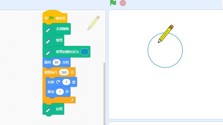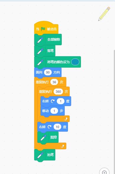 根據(jù)之前的課程和積木指令的字面意思,我們很容易理解每個指令的意思,其中圖章的功能可以理解為復制。下面以案例逐步來講解,我們要用畫筆來畫一個圓,值得注意的是,使用畫筆之前要先落筆,畫完之后要抬筆,跟現(xiàn)實中繪畫是一樣的,代碼如下