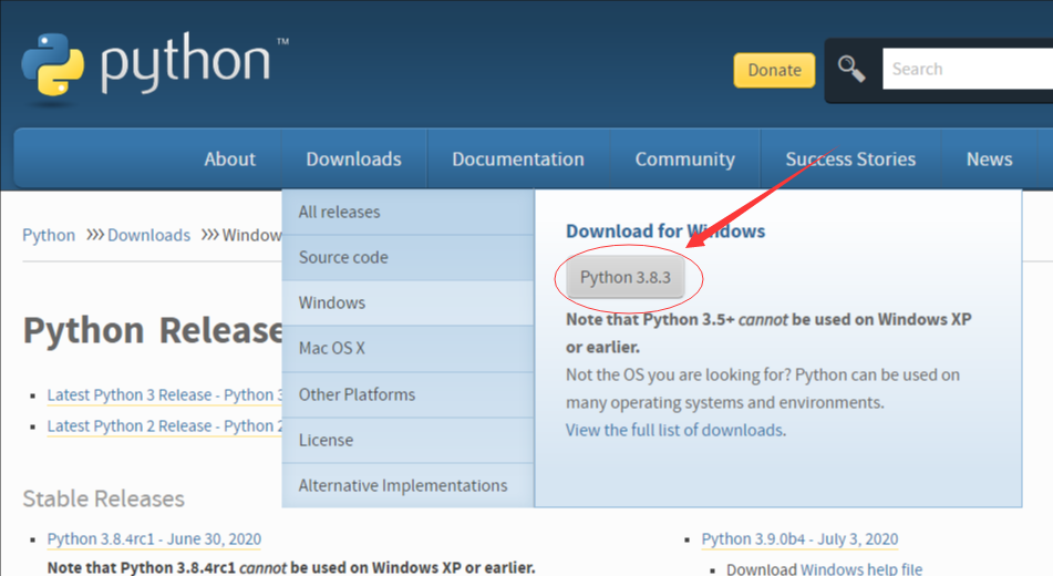 安裝python,本節課以windows10操作系統為例(其他操作系統安裝類似),首先要登錄python的官方網站,https://www.python.org/ 點擊導航欄Downloads,選擇windows,然后點擊后面的版本號下載,如下圖,這里下載的是3.8.3版本。(如果后邊版本號部分沒有顯示,國外服務器比較慢請稍等幾秒鐘,等網頁完整加載后就能看到)
