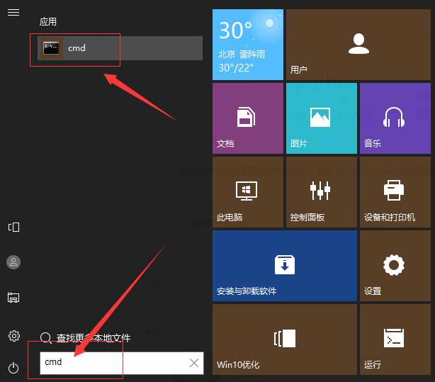 那么如何判斷是否安裝成功呢?我們點擊windows起始圖標,在搜索框輸入cmd,選擇進入控制臺,如下圖:
