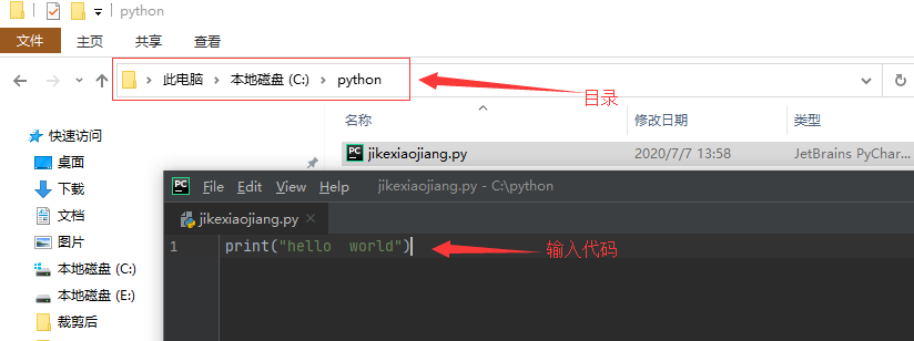 首先我們在C盤python文件夾目錄下建立jikexiaojiang.py文件。并且在jikexiaojiang.py文件中輸入print("hello world"),如下圖