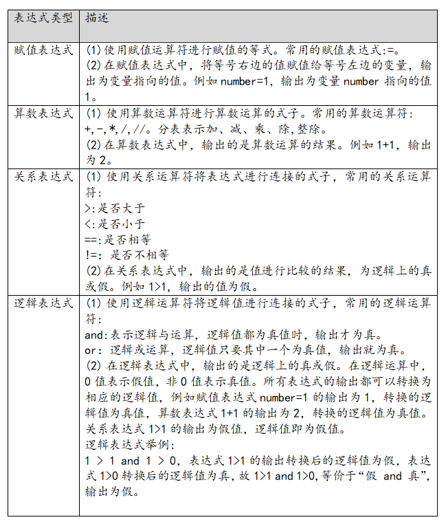 程序中的表達式類似于人類說話的表達式,比如人類說的“我愛你”就是一個表達式。同理python中的表達式例如 “1+1”,這個表達式的輸出結果為2。以下總結了編程中的主要表達式: