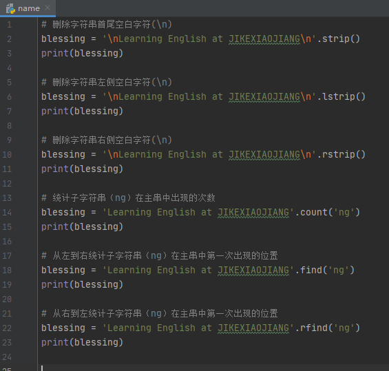 str.strip():刪除字符串首尾的空白字符,返回一個首尾不包含空白字符的新字符串。