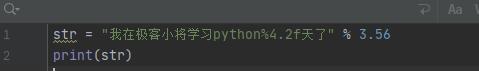我們可以看到輸出結果為浮點類型,并且小數(shù)點后自動保留了6位,這時候呢,我們需要來控制浮點類型的精度。他的格式是%m.n f 。m指的是顯示的最少總寬度,總寬度包含后面的小數(shù)點,如果格式化內容的寬度不足m位,則會在格式化輸出中補空格。n指的是小數(shù)點后面顯示的位數(shù),小數(shù)點后的位數(shù)大于n時會進行四舍五入。