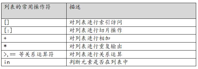 列表類型常用的操作符如下表所示:[]操作符表示使用索引訪問(wèn)列表的元素。正索引從0開(kāi)始進(jìn)行編號(hào),表示數(shù)據(jù)集合中的第一個(gè)元素。負(fù)索引從-1開(kāi)始編號(hào),表示數(shù)據(jù)集合中的倒數(shù)第一個(gè)元素。正負(fù)索引值必須在有效的范圍之內(nèi),否則會(huì)拋出越界訪問(wèn)的錯(cuò)誤信息。如下示例:輸出結(jié)果為: