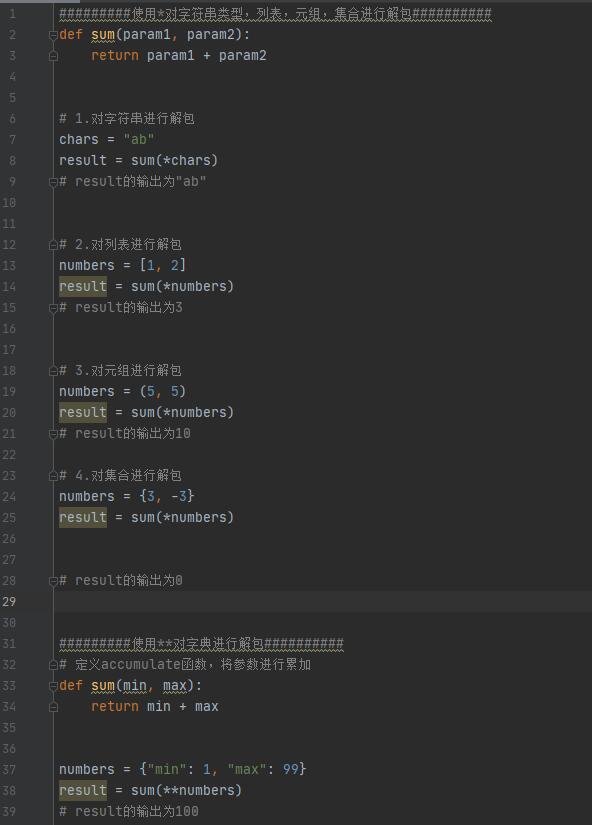 在定義函數(shù)時(shí)使用*或**,是將實(shí)參收集到元組或字典中。而在調(diào)用函數(shù)時(shí)使用*或**來進(jìn)行修飾,則是將實(shí)參進(jìn)行解包。所謂的解包,就是將數(shù)據(jù)集合中的元素取出,然后賦值給對應(yīng)的參數(shù)。通常情況下我們用使用*對可迭代對象進(jìn)行解包,使用**對字典進(jìn)行解包