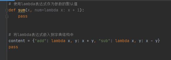 由于lambda的簡(jiǎn)化性,也注定他不能實(shí)現(xiàn)復(fù)雜的邏輯代碼。因此經(jīng)常使用lambda表達(dá)式作為參數(shù)的默認(rèn)值、將lambda表達(dá)式嵌入到字典結(jié)構(gòu)中以及將lambda表達(dá)式作為返回值,以下舉例說明: