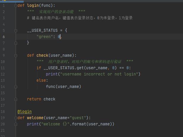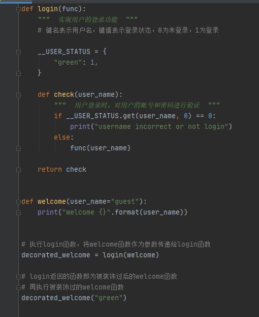Python中提供了語法糖,在函數頭前面加上一行@decortator的修飾符,可以對當前函數進行裝飾,decortator表示具體的裝飾器名。在上文的代碼中,login函數就是一種裝飾器,現在使用@符號來對welcome函數進行裝飾。以上程序可以修改為: