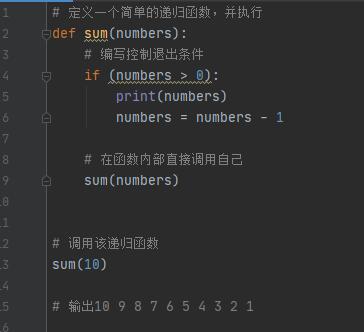 在設計遞歸函數時,必須定義一個退出邊界,否則函數會不斷地遞歸執行,一旦超出Python語言所支持的遞歸深度,那么就會拋出RecursionError的錯誤異常。我們可以在函數體中使用控制語句加一段控制邏輯,當遞歸函數在條件不滿足時就終止遞歸。我們將上面的遞歸函數進行修改來輸出1-10之間的整數,如下: