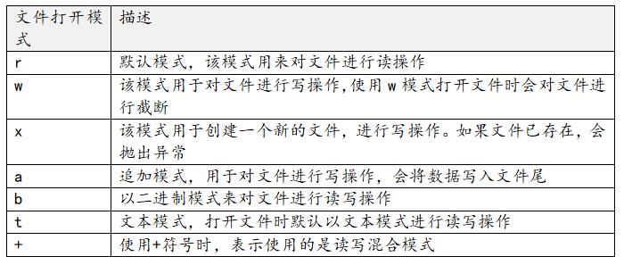 file 對應的是文件的路徑名,mode 對應的是文件的打開模式,buffering對應的是文件緩沖,encoding對應的是文件數據流的編碼, errors表示的是對文件的讀寫過程中出現了編碼問題時,該以什么樣的方式進行處理。在通過open函數對文件進行讀寫操作前,我們需要先掌握文件的打開模式。