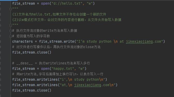 file_stream.writelines(lines):這里的lines既可以是字符串類型,也可以是序列類型,如果是序列類型,元素必須是字符串。在writelines方法中,同樣得手動地在字符串后面加上換行符,以表示一行。writelines方法沒有返回值。
