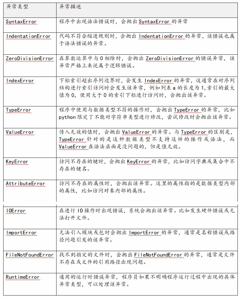 其它更多的異常類型,同學們可以查閱Python的官方文檔。Python預定義的這些異常,是為方便程序員對異常進行處理。在程序中對可能出現的異常進行處理,可以增強程序的健壯性。