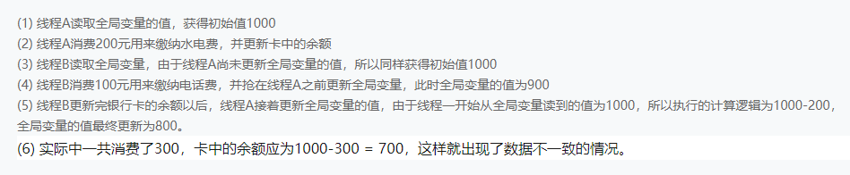 進程內(nèi)有一個全局變量,初始值1000,表示銀行卡中的余額,進程中有兩個線程不斷進行消費,并更新全局變量的值。