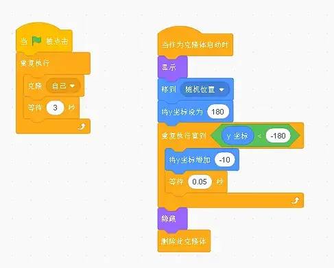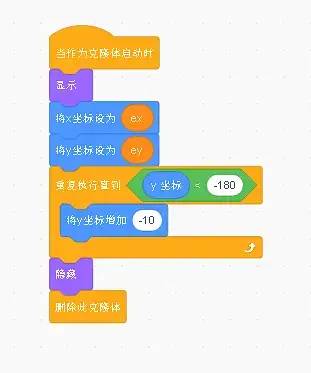 接下來,當敵機作為克隆體出現時,我們需要控制它在隨機位置的頂部出現,出現后每隔一段時間向下飛行一段距離,直至到達底部,完整積木組合如下