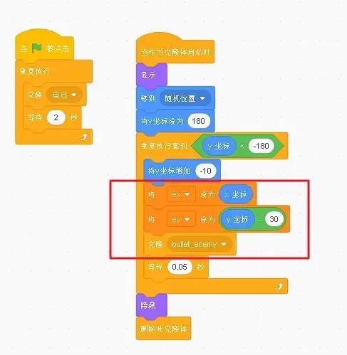 在敵機的移動邏輯中添加生成子彈的積木,敵機(craft_enemy)角色修改后的全部內容如下