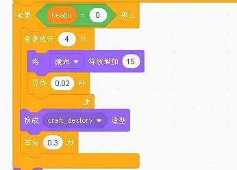 添加代碼當敵機生命值為0時,產生旋渦特效并切換為毀滅狀態。每個0.02秒敵機模型旋轉15,執行4次后切換為毀滅狀態,停留0.3秒后消失