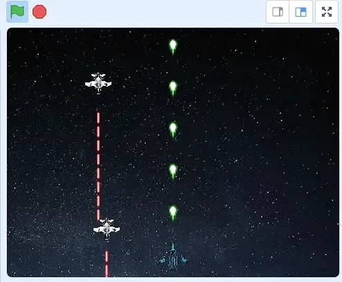 原因在于bullet_player中的代碼,是當“綠旗子”觸發時,才執行一系列操作,飛機移動時,克隆的子彈并沒有隨著飛機移動。