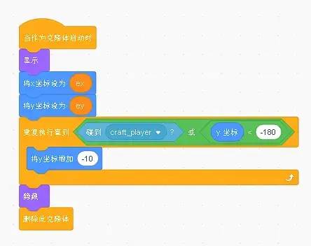 在craft_enemy(敵機)的編程區域完成積木組合,當“初始事件”開始后,“重復執行”,每隔3秒“克隆自己” 積木組合如下:
