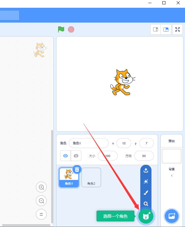 本節(jié)課講解如何使用Scratch添加一個(gè)角色,點(diǎn)擊選擇一個(gè)角色按鈕,如圖: