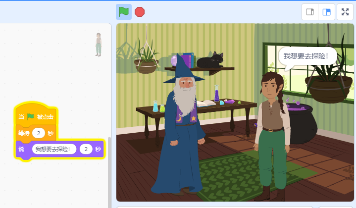 我們在白胡子男巫說話之前,添加了【顯示】指令。這個過程叫做程序測試發現Bug并且修復Bug。修復之后我們再次測試,發現已經沒有問題了。