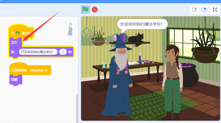 那么我們就要修改我們的代碼,來考慮一下程序初始化的問題。我們可以在程序運行時添加一個積木指令。讓白胡子男巫出現。