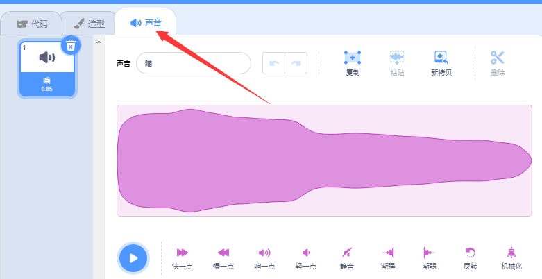 上節課我們通過口技的演示,簡單了解的聲音的輸入輸出。這節課我們詳細講解如何錄制聲音,點擊Scratch界面左上角選項卡,切換到聲音面板,如下: