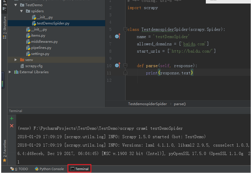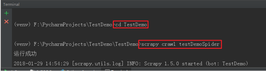 簡介Pycharm中scrapy的運行:法一:Scrapy爬蟲的運行需要到命令行下運行,在pychram中左下角有個Terminal,點開就可以在Pycharm下進入命令行,默認是在項目目錄下的,要運行項目,需要進入下一層目錄,使用cdTestDemo進入下一層目錄,然后用scrapycrawl爬蟲名,