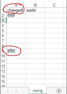 import xlrd #導(dǎo)入模塊 from xlutils.copy import copy #導(dǎo)入copy模塊 rb = xlrd.open_workbook('weng.xls') #打開weng.xls文件 wb = copy(rb) #利用xlutils.copy下的copy函數(shù)復(fù)制 ws = wb.get_sheet(0) #獲取表單0 ws.write(0, 0, 'changed!') #改變(0,0)的值 ws.write(8,0,label = '好的') #增加(8,0)的值 wb.save('weng.xls') #保存文件運(yùn)行結(jié)果: