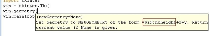 我們可以輸入win.geometry( ,左邊的單括號會引出該方法的提示。dMG少兒編程網(wǎng)-Scratch_Python_教程_免費兒童編程學(xué)習(xí)平臺