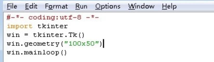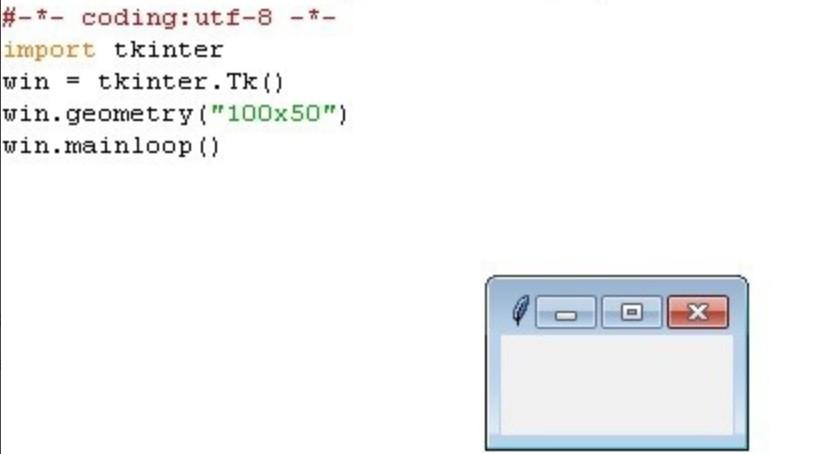 #-*- coding:utf-8 -*- import tkinter win = tkinter.Tk() win.geometry("100x50") win.mainloop()