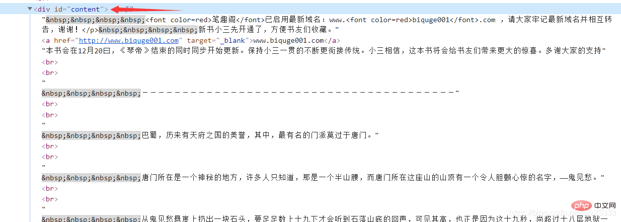 for url in urls: href = "http://www.biquge001.com/" + url['href'] # 字符串的拼接 拼接成正確的網址 pageName = url.text # 每章的章名然后每章小說的內容都存放在<p id=“content” 里 同理得
