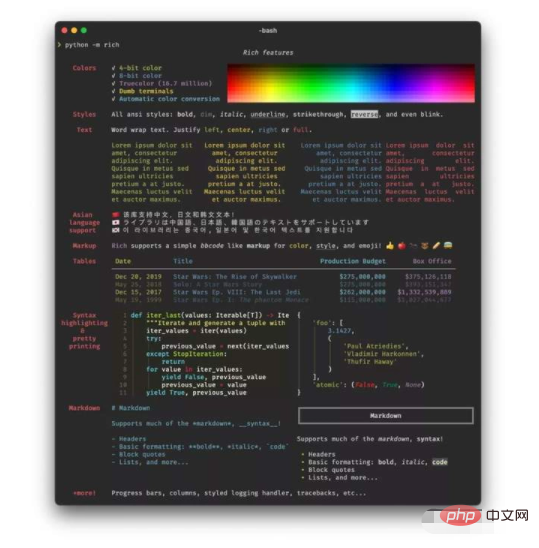 Rich API不僅能夠在終端輸出提供豐富的彩色文本和精美的格式,還提供了精美的表格、進(jìn)度條、編輯器、追蹤器、語法高亮等。如下圖所示。bJZ少兒編程網(wǎng)-Scratch_Python_教程_免費兒童編程學(xué)習(xí)平臺