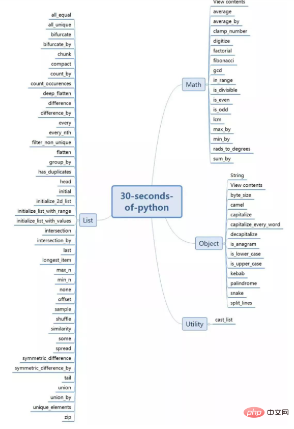 https://github.com/30-seconds...內容目錄下面是30秒學Python的整個目錄,分為幾大板塊:List、Math、Object、String、Utility,以下是整理的思維腦圖。Caq少兒編程網-Scratch_Python_教程_免費兒童編程學習平臺