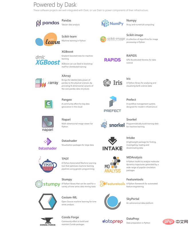 目前,Dask可支持pandas、Numpy、Sklearn、XGBoost、XArray、RAPIDS等等,光是這幾項我覺得就足夠用了,至少對于常用的數據處理、建模分析是完全覆蓋得掉的。