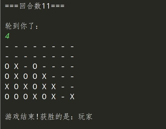 def leftSlashIsWinning(board,chess_type,symbol): #表示左上綠色部分 for init_height in range(3): for init_line in range(init_height + 1): if board[init_height][init_line] == board[init_height + 1][init_line + 1] == board[init_height + 2][init_line + 2] == board[init_height + 3][init_line + 3] == chess_type: print(" 游戲結束!獲勝的是:" + symbol[chess_type]) exit(0) #表示右下綠色部分 for init_height in range(3,6): for init_line in range(init_height+2,8): if board[init_height][init_line] == board[init_height - 1][init_line - 1] == board[init_height - 2][init_line - 2] == board[init_height - 3][init_line - 3] == chess_type: print(" 游戲結束!獲勝的是:" + symbol[chess_type]) exit(0) #中間特殊情況 for init_height in range(3): init_line = init_height +1 if board[init_height][init_line] == board[init_height + 1][init_line + 1] == board[init_height + 2][init_line + 2] == board[init_height + 3][init_line + 3] == chess_type: print(" 游戲結束!獲勝的是:" + symbol[chess_type]) exit(0)完整代碼: