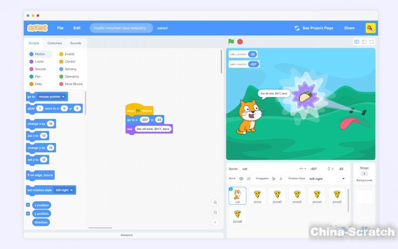 而“運動”這個藍色模塊就是控制“小貓”在舞臺上的運動。有具體參數(shù)和參考系可以控制。