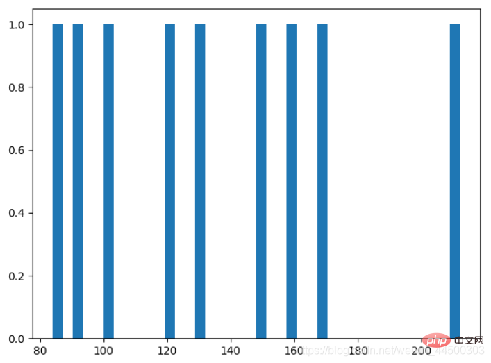 假設有一個二維數組img=[[159,120,130],[100,84,92],[168,150,212]]。其數字表示圖像的像素值,展平后img=[159,120,130,100,84,92,168,150,212],使用hist函數繪制出的直方圖如下圖。橫軸表示像素值,縱軸表示該像素值出現的頻率