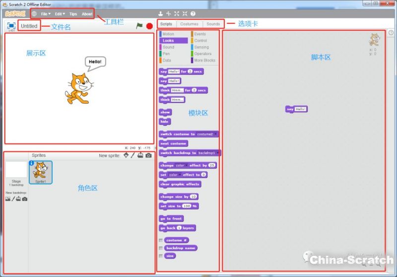 Scratch軟件都包括什么內(nèi)容呢?下面簡單介紹一下: 打開軟件后,會看到下面的內(nèi)容。這個軟件分為左上-展示區(qū)、左下角色區(qū)、右-腳本區(qū)三大部分,中間最復雜的部分是模塊區(qū)。此外還有工具欄、選項卡等其它部分,我們在后面的課程中慢慢來學習了解。 我們