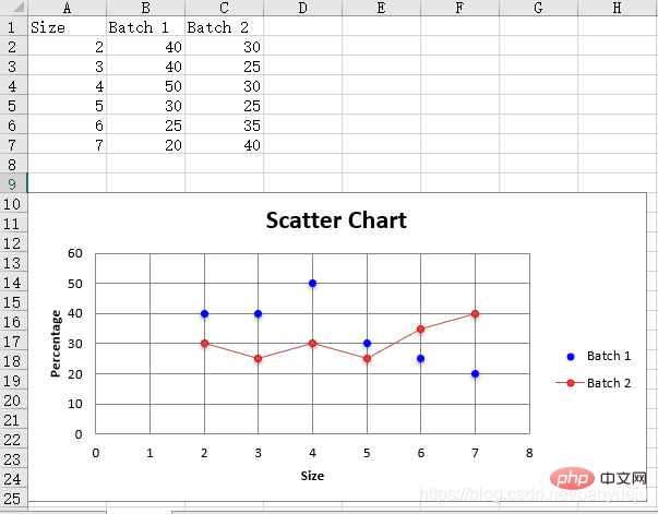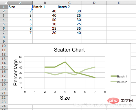 """ __author__ = '伴月雎' __time__ = '2021/4/21 19:15' """ from openpyxl import Workbook from openpyxl.chart import ( ScatterChart, Reference, Series, ) wb = Workbook() ws = wb.active rows = [ ['Size', 'Batch 1', 'Batch 2'], [2, 40, 30], [3, 40, 25], [4, 50, 30], [5, 30, 25], [6, 25, 35], [7, 20, 40], ] for row in rows: ws.append(row) chart = ScatterChart() chart.title = "Scatter Chart" chart.style = 10 chart.x_axis.title = 'Size' chart.y_axis.title = 'Percentage' xvalues = Reference(ws, min_col=1, min_row=2, max_row=7) for i in range(2, 4): values = Reference(ws, min_col=i, min_row=1, max_row=7) series = Series(values, xvalues, title_from_data=True) chart.series.append(series) # 第一條散點(diǎn) s1 = chart.series[0] # 散點(diǎn)標(biāo)記類(lèi)型 'auto', 'dash', 'triangle', 'square', 'picture', 'circle', 'dot', 'plus', 'star', 'diamond', 'x' s1.marker.symbol = "circle" s1.marker.graphicalProperties.solidFill = "0000FF" # Marker filling 設(shè)定標(biāo)記填充的顏色 s1.marker.graphicalProperties.line.solidFill = "0000FF" # Marker outline 標(biāo)記輪廓的顏色 s1.graphicalProperties.line.noFill = True # 關(guān)閉連線(xiàn)填充 # 第二條帶連線(xiàn)的散點(diǎn) s2 = chart.series[1] s2.marker.symbol = "circle" s2.graphicalProperties.solidFill = "FF0000" s2.marker.graphicalProperties.line.solidFill = "FF0000" s2.graphicalProperties.dashStyle = "dash" s2.graphicalProperties.line.width = 1000 # width in EMUs ws.add_chart(chart, "A10") wb.save("scatter.xlsx")效果如下:uwA少兒編程網(wǎng)-https://www.pxcodes.com