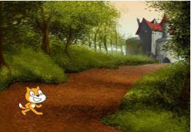編程實現: 小貓從坐標點(-165,-93)出 發向城堡走去。隨著位置的移 動,角色大小逐漸變小,最后 在城堡前消失。