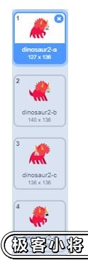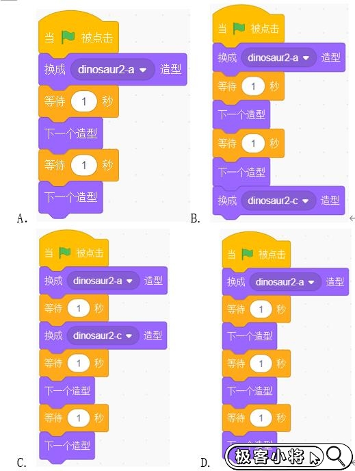 9. Dinosaur2角色的造型如下,下列哪個選項里的代碼可以實現造型從第一個開始,一個一個按順序切換到第四個造型的功能?( )