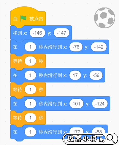 場景介紹:球場上有三個標記和一個終點紅旗標記,小貓需要把球依次踢到標記位置,最后把球踢到紅旗位置。知識點:①滑行積木的應用②滑行和移動積木的區別評價點:①點擊綠旗后,球先滑行到標記,小貓隨后滑行到②到達終點后,小貓說一句話,并播放聲音特效拓展練習:加入一個