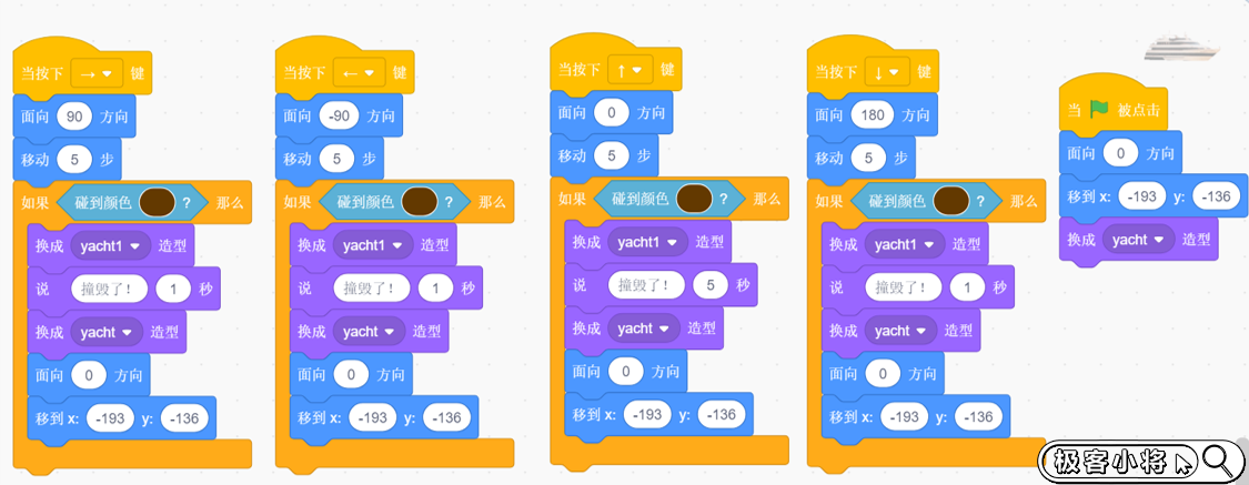 場景介紹:通過鍵盤按鍵控制輪船沿著航道標(biāo)記行駛,如果撞到航道邊緣,輪船會(huì)撞毀。知識(shí)點(diǎn):①鍵盤事件②偵測碰到顏色③角色位置、方向、造型初始化評價(jià)點(diǎn):①點(diǎn)擊綠旗后,船出現(xiàn)在起始②上、下、左、右鍵可以控制輪船向相對性方向移動(dòng)③碰到邊緣,撞毀,并回到起始位置拓展練