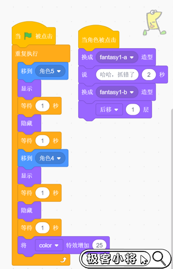 ②點(diǎn)擊小精靈,它會說“抓到我了”,程序結(jié)束