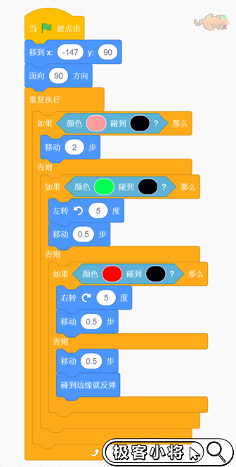 場景介紹:小貓沿著黑色線條自動移動。知識點:①嵌套條件判斷②顏色探測器,積木顏色碰到顏色的應用③繪制背景線條④編輯角色,修改顏色評價點:①點擊綠旗后,小貓能沿著黑色線條自動移動拓展練習:①增加移動的步長,測試小貓還能自動巡線嗎②繪制不同的黑線,檢查小貓還能