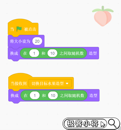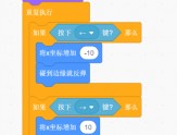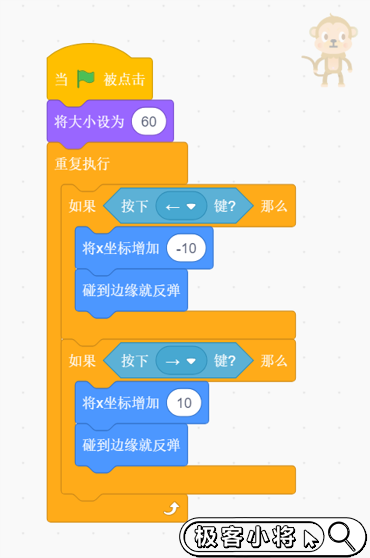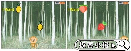 程序介紹:秋天來了,各種水果都成熟了,紛紛從樹上掉下來,目標物品在屏幕左上角不斷變化,接到正確的得分,否則減分。知識點:①新建變量②初始化變量③改變變量的值④角色造型號⑤隨機數評價點:①小猴子可以左右移動②接到目標水果加一分,接到錯誤水果減一分③目標水果隨