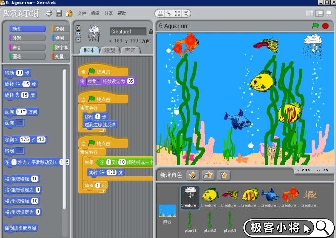 魚,在海洋里自由地游來游去。在池塘里快樂地游泳。輕快地穿梭在小溪邊。在魚缸里悠閑地游來游去。魚兒是多么的自由歡快,老師在“動畫”文件夾中打開了第六個“水族館”的例子,同學們可以在scratch中看看這個例子。回想一下,這是我見過的最有影響力的一張快樂魚的照片,并自己創作了一個動畫。